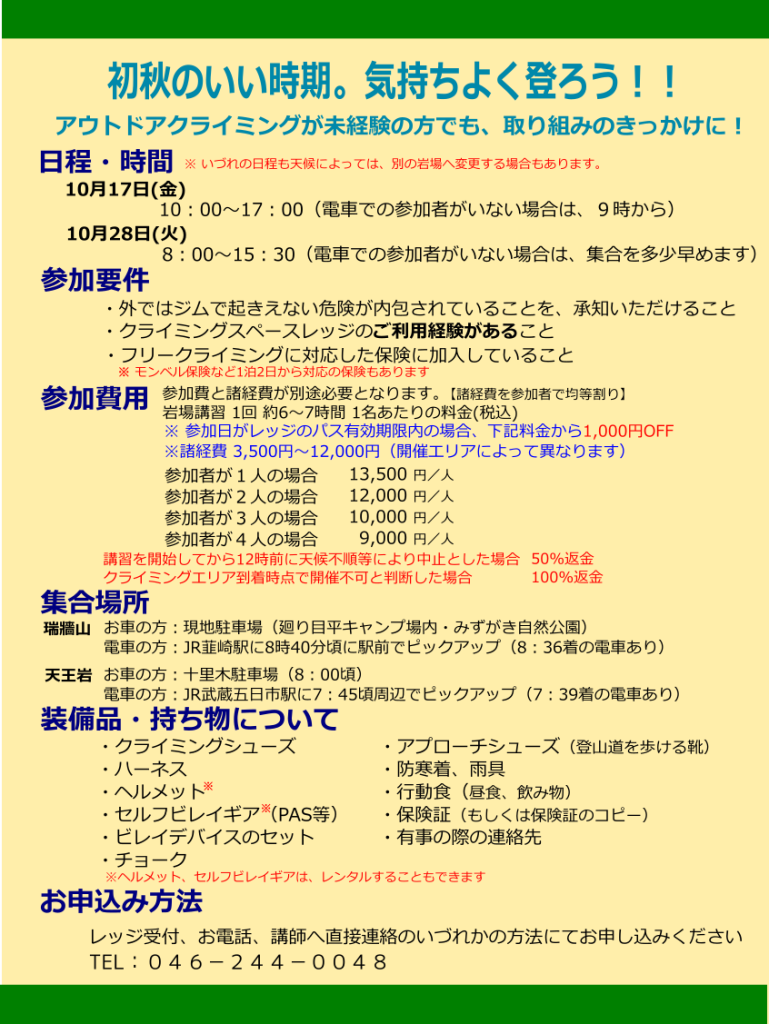 Ledgeアウトドア クライミングスクール 10月の募集 その2