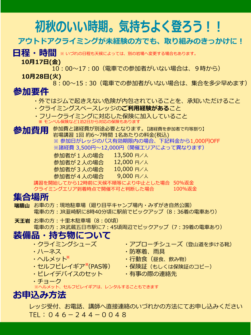 お知らせ2025.09.23Ledgeアウトドア クライミングスクール 10月の募集 その2