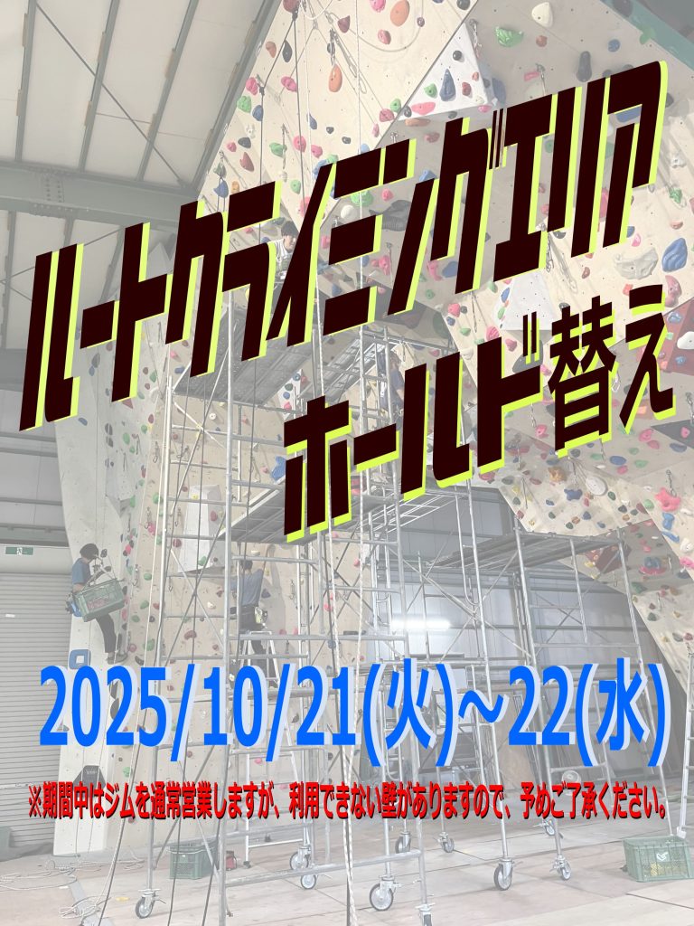 今回のホールド替え実施期間中も登攀禁止エリアがありますが、通常営業いたします。