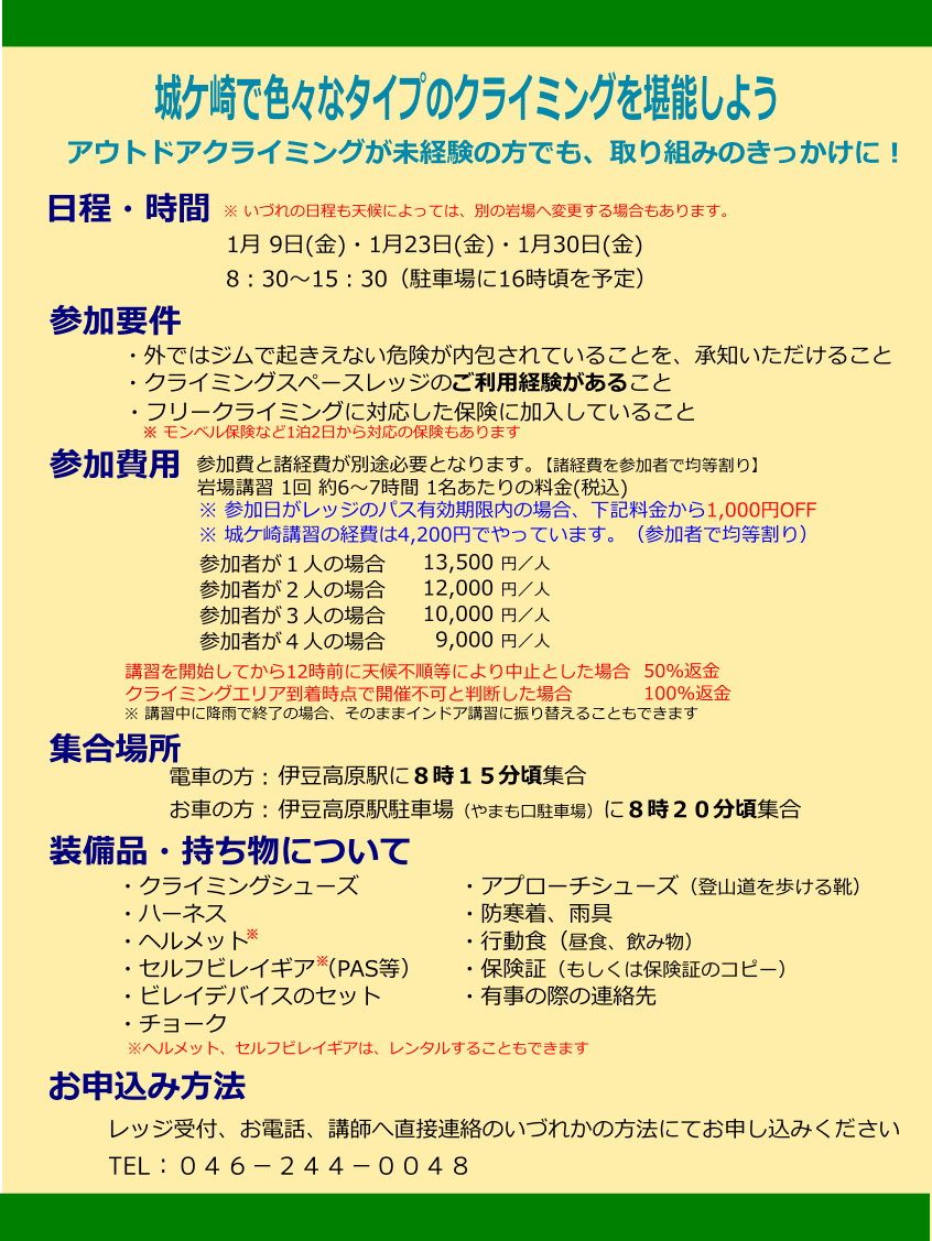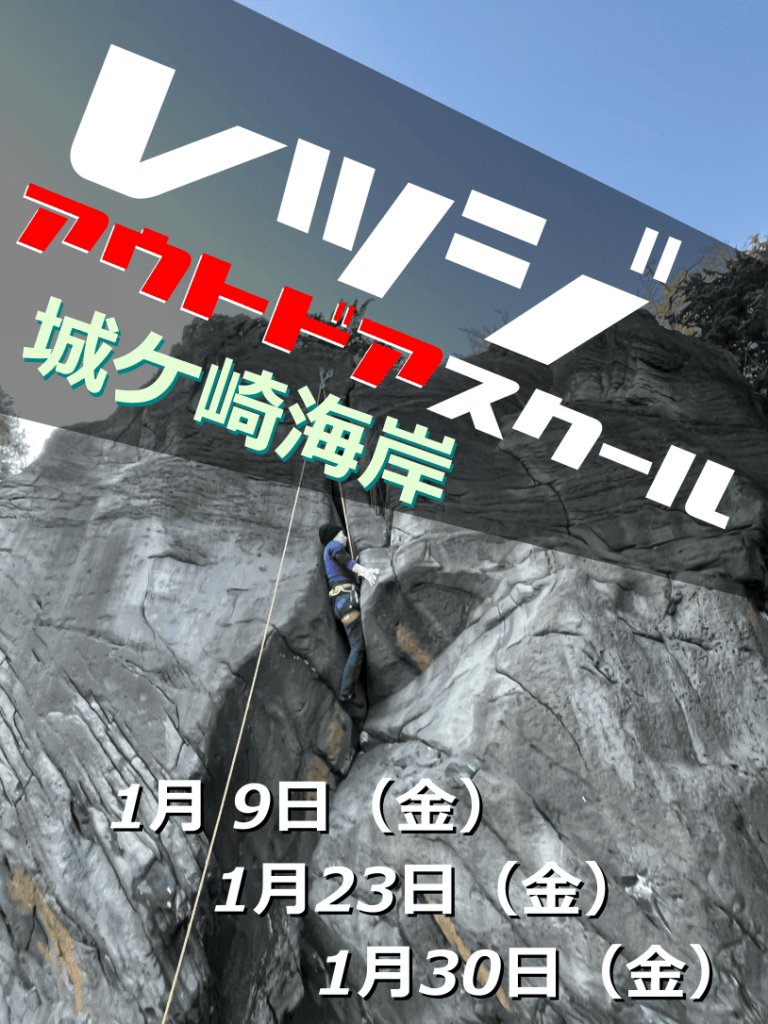 1月のアウトドアスクールは、湯河原幕岩・城ケ崎で募集致します。