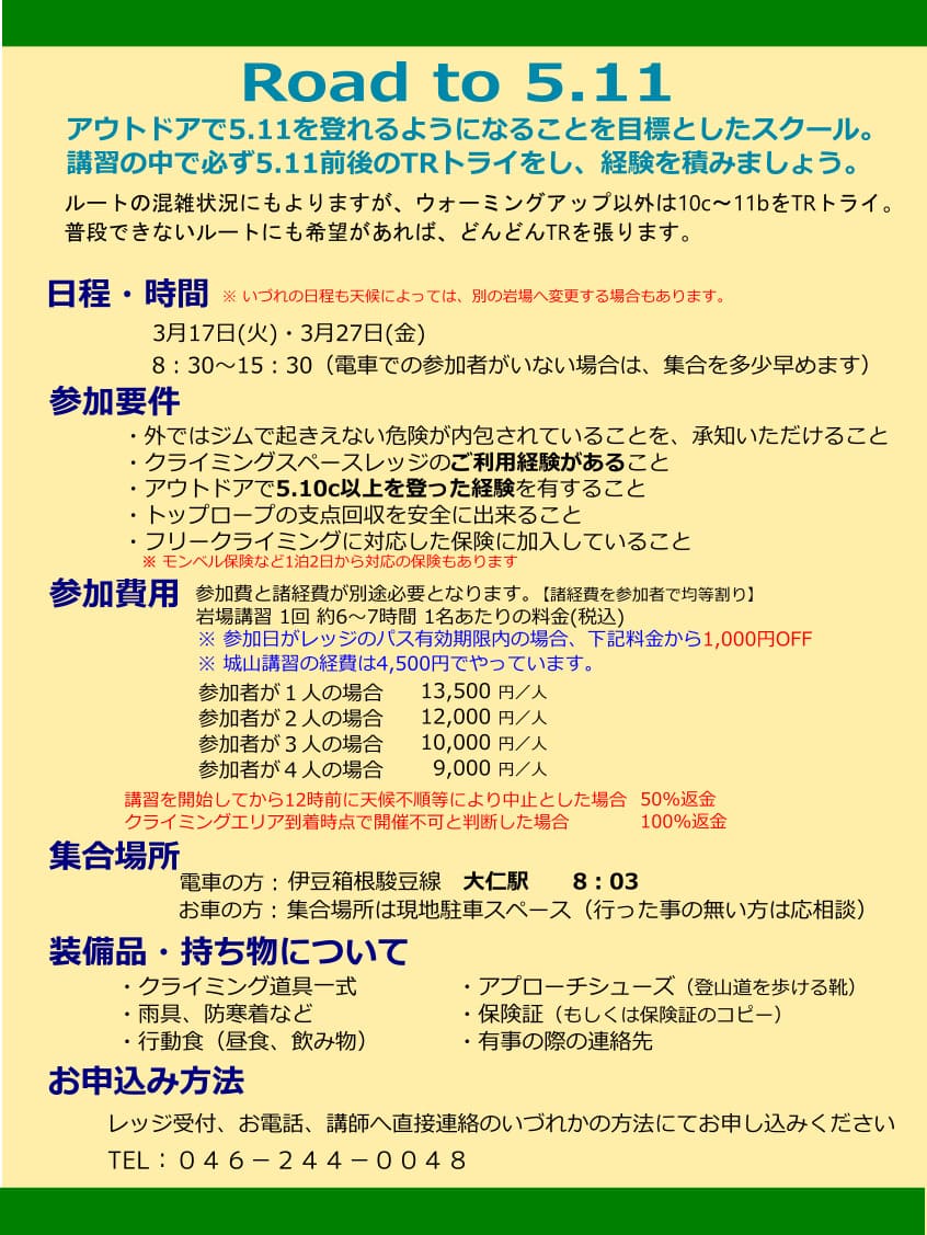 お知らせ2026.03.06【追加】Ledgeアウトドア クライミングスクール 3月の募集